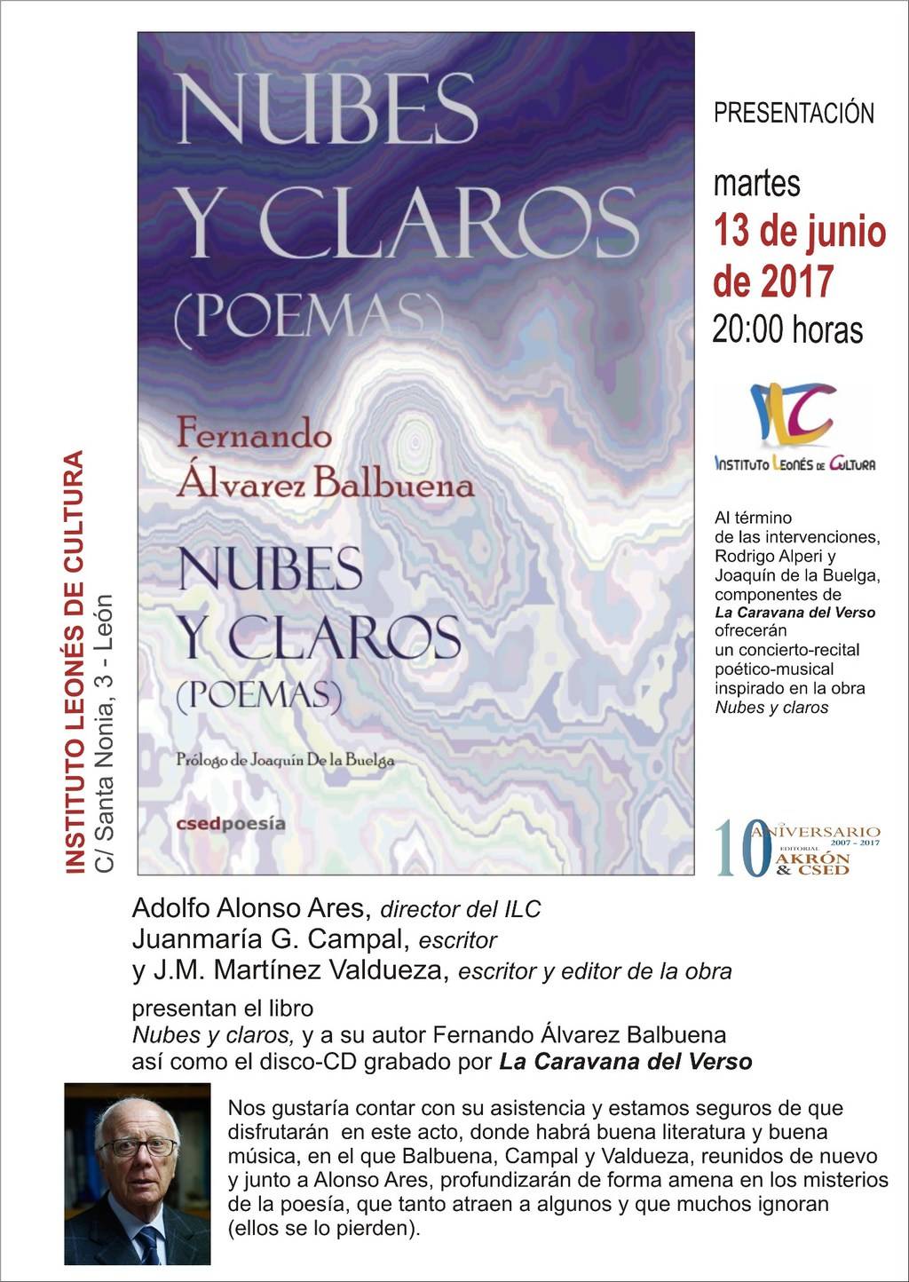 El martes 13 de Junio a las 20:00 h., se presentará en el Instituto Leonés de Cultura (León) el poemario de Fernando Álvarez Balbuena Nubes y claros así como el disco-CD inspirado en el mismo y grabado por el grupo “La Caravana del Verso”.