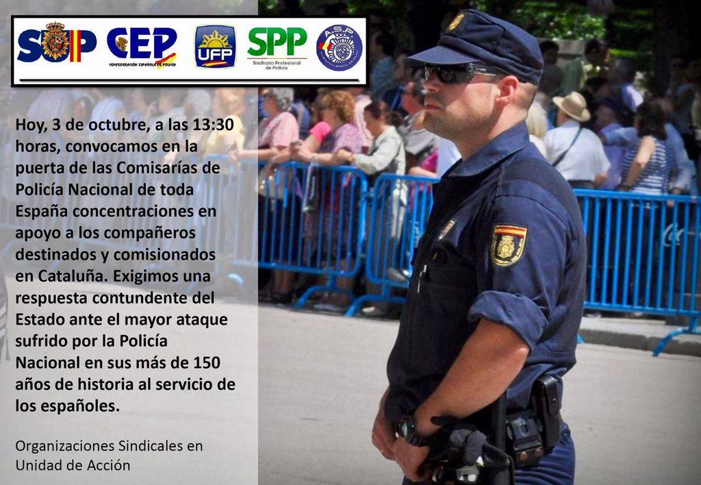 Concentraciones en todas las comisarías de la Policía Nacioal de España, hoy día 3 a las 13:30, en apoyo de los agentes destacados en Cataluña y que están siendo acosados y vejados por los independentistas. Se le exige al Gobierno de España que actúe de una vez y con la contundencia que los hechos reclaman.