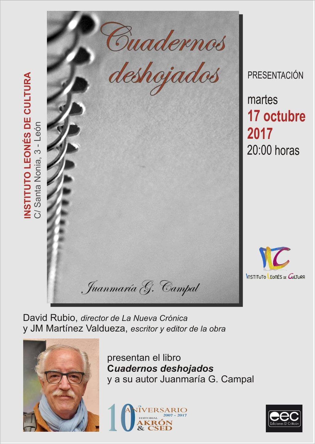 El martes 17 de Octubre, a las 20:00 horas, en la Sala Región del Instituto Leonés de Cultura (León), Juanmaría G. Campal presentará su libro "Cuadernos deshojados". Estará acompañado por el periodista y director de La Nueva Crónica David Rubio y por el escritor y editor de la obra Juan Manuel Martínez Valdueza.