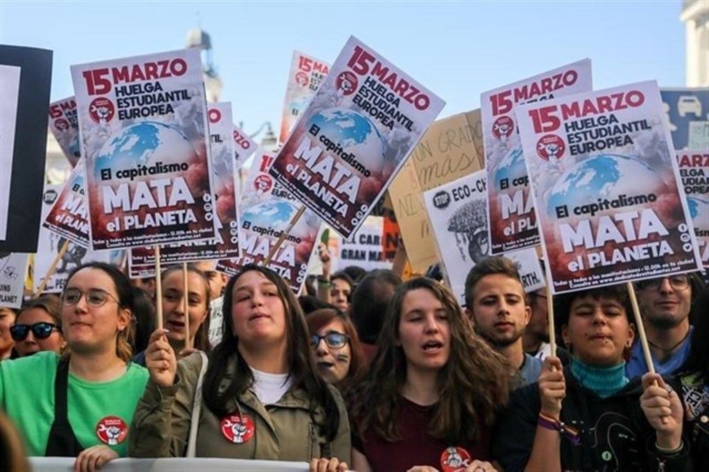 Digo entre otras cosas porque aunque la de Madrid estaba organizada por el Sindicato de Estudiantes y a priori pretendía ser apolítica, ya fuera por la asistencia de grupos políticos con sus eurodiputados al frente, o por la nutrida presencia de juventudes socialistas, enseguida quedó claro por las pancartas: “el capitalismo mata al planeta” que detrás había algo más que la sostenibilidad. Se lanzaron por megafonía consignas de todo tipo que nada tenían que ver con el ecologismo llegando hasta cerca del Congreso de los Diputados a donde no pudieron acceder al grito de “no nos representan”.