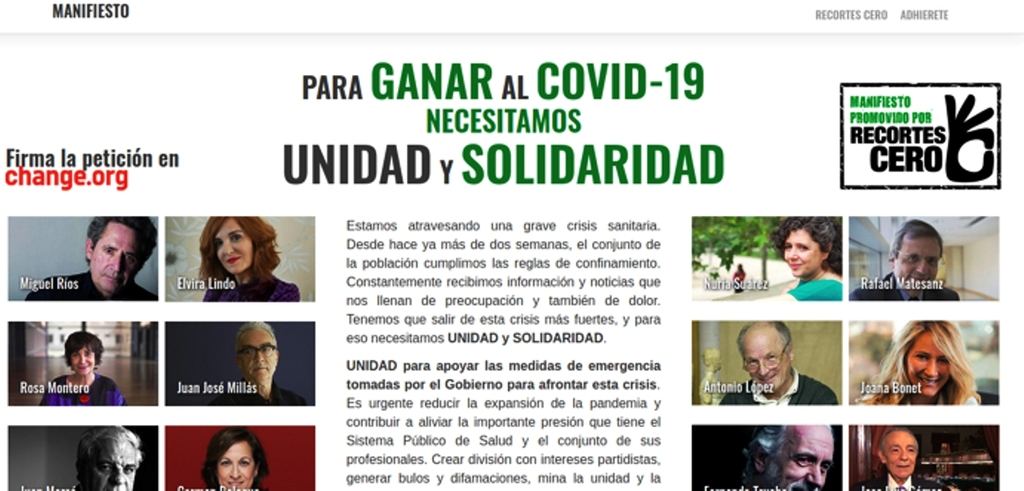 Junto con personalidades, activistas y ciudadanos en general de toda España hemos promovido un manifiesto que llama a la unidad y a la solidaridad para “ganar al COVID-19”. El manifiesto “Para ganar al COVID-19 necesitamos unidad y solidaridad” se lanzó el día 1 de abril en las redes y como publicidad en la prensa digital. En las 24 horas siguientes se disparó el número de personas que también se han adherido al manifiesto. Y según pasan los días sigue aumentando exponencialmente la gente que firma utilizando el sistema de change.org para apoyar el manifiesto.
