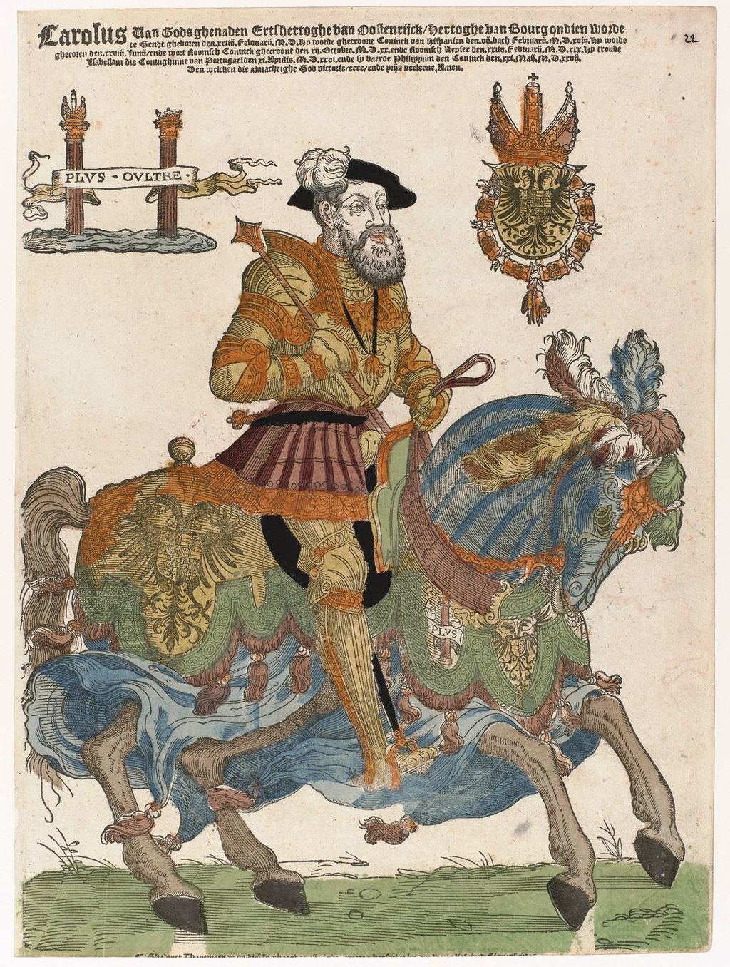 ... A la izquierda del emperador se ubican las llamadas Columnas de Hércules, las cuales aparecen siempre unidas por una porción de tela con el lema “Plus Oultre” (más allá).