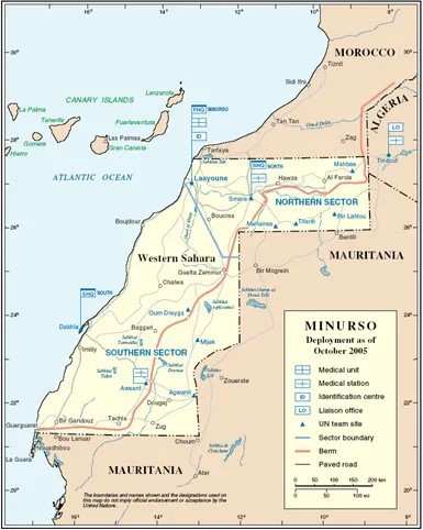 Mapa de la MINURSO del Sahara Occidental (Misión de las Naciones Unidas para el referéndum en el Sahara Occidental)