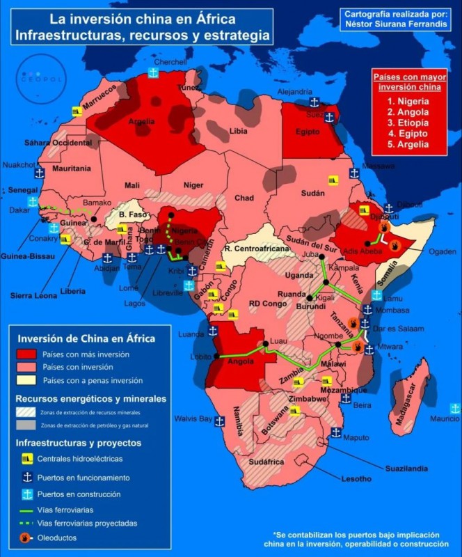 China ha concentrado su actividad económica en varias naciones africanas que considera estratégicas: Angola, Nigeria, República Democrática del Congo, Etiopía, Kenya y Sudáfrica. Para financiar carreteras, puertos estratégicos, parques industriales, puentes, centrales hidroeléctricas y solares China ha invertido en estos países miles de millones de dólares. A cambio obtienen contratos de explotación minera o petrolera.